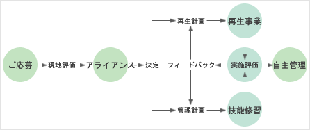 再生事業・技能修習の実施後の評価を行い、必要に応じて、再生計画・管理計画へのフィードバック・再構築を行います。
